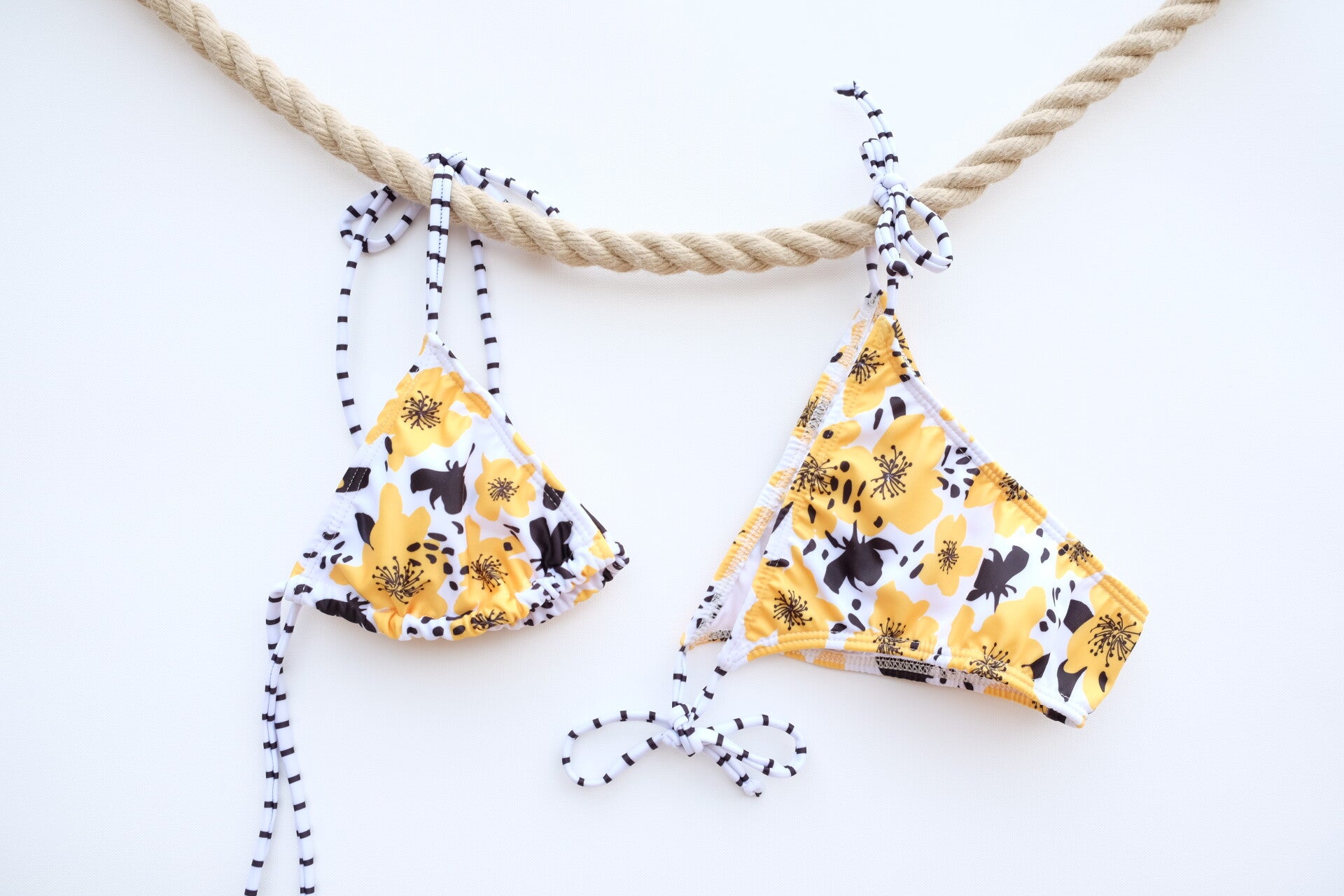 MIX&MATCH Puedes combinar top y braga como más te gusten! - Top triangulo, con tiras de anudar en los laterales. - Top fijo triangulo. Tirantes fijos con broche regulable espalda. - Braguita lazos brasileña con tiras de anudar en los laterales. - Braguita brasileña.